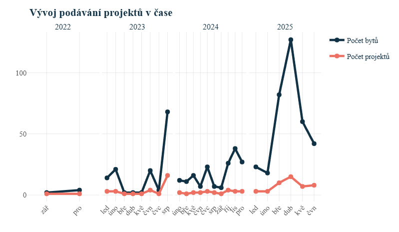 V jednotlivých letech počty podaných projektů v sociálním bydlení IROP kolísaly. K jejich významnému nárůstu došlo zejména na počátku roku 2025. Postupně se zvětšuje i velikost projektů. Za březen a duben 2025 IROP eviduje 25 nově podaných projektů s více než 200 sociálními byty.
