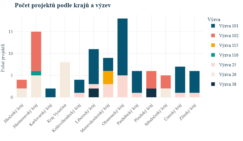 Zajímavou výjimkou je Kraj Vysočina, kde byl naopak výrazně vyšší zájem o starší výzvu, ve které jsme podpořili 8 projektů (Výzva 26).